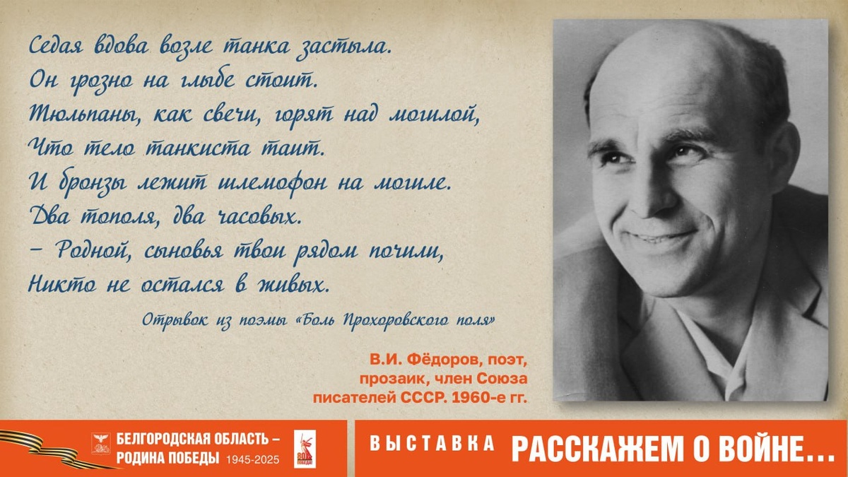 #Расскажем_о_войне... Друзья, в нашем музее работает выставка «Расскажем о войне…», посвящённая творчеству писателей-фронтовиков Белгородчины. Её экспонаты знакомят с биографией и литературным творчеством членов Союза писателей, участников Великой Отечественной войны 1941–1945 гг. Среди них Фёдоров Владимир Иванович, поэт, прозаик, член Союза писателей СССР, уроженец г. Белгорода. Военному времени и однополчанам Владимиром Ивановичем посвящены стихи, поэмы, повести, которые включены в сборники «Шумит дубрава», «Отзовитесь друзья», «Сквозь испытания», «Боль Прохоровского поля» и др. Седая вдова возле танка застыла. Он грозно на глыбе стоит. Тюльпаны, как свечи, горят над могилой, Что тело танкиста таит. И бронзы лежит шлемофон на могиле. Два тополя, два часовых. – Родной, сыновья твои рядом почили, Никто не остался в живых. ✒️ Отрывок из поэмы «Боль Прохоровского поля» Познакомиться с материалами выставки можно до 24 августа. #музей #БГИКМ #выставка