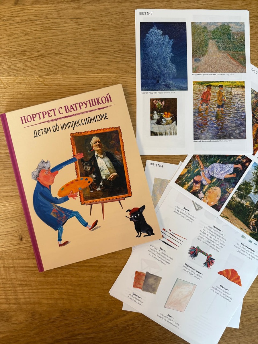 А еще Музей русского импрессионизма продолжает радовать не только выставками, но и своей издательской программой. Помимо каталогов экспозиций (некоторые из которых я показывала в канале здесь, здесь и здесь), команда музея выпустила книгу «Портрет с Ватрушкой: детям об импрессионизме». Ватрушкой звали французского бульдога Алексея Исупова - её русский художник изобразил рядом с собой на знаменитом автопортрете. И как я шучу, Ватрушка – наш ответ знаменитому бульдогу по имени Мужик Ив Сен-Лорана. Взрослым будет точно интересно читать эту книгу с детьми - в ней собраны любопытные факты об импрессионизме и импрессионистах, например, как Мане рисовал Моне. А дети должны быть в восторге от заданий - найти и наклеить репродукцию картины, поупражняться в рисовании на страницах книги - такое не часто можно встретить в издании в твердой обложке