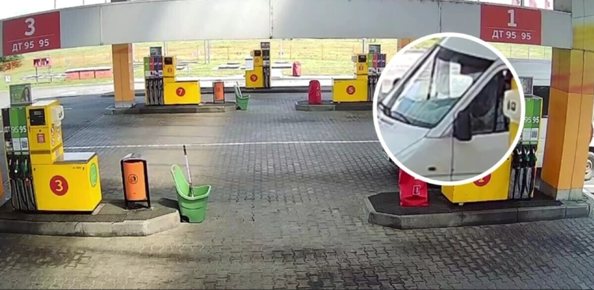 На видеозаписи, которую показало УВД Брестского облисполкома, видно, как белый микроавтобус подъезжает к топливораздаточной колонке. После остановки водитель перебирается через салон на пассажирское сиденье и выходит из автомобиля через правую дверь, а не через свою.