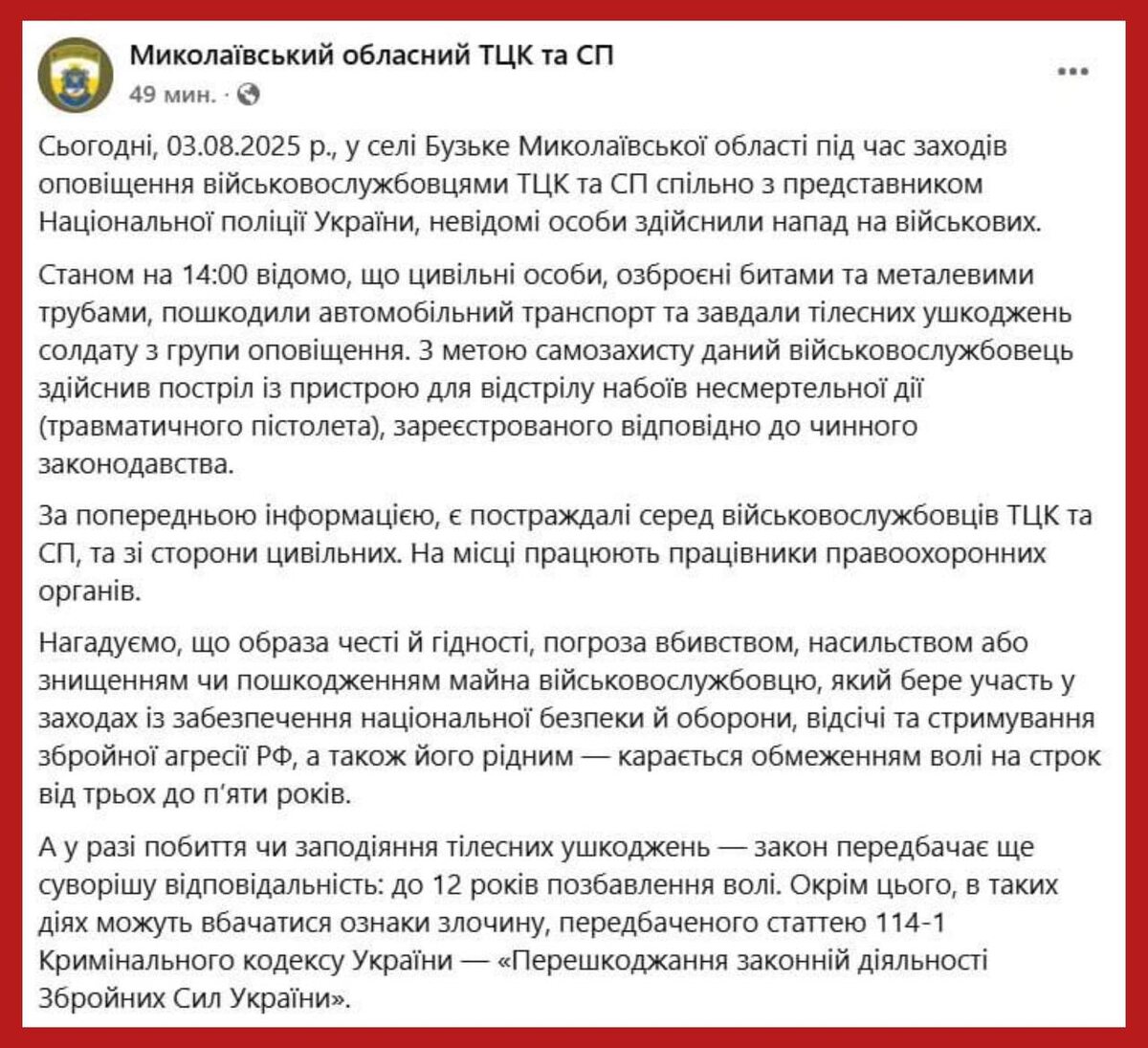Гражданские с битами и металлическими трубами напали на карателей ТЦК в Николаевской области. Один из карателей выстрелил из травматического пистолета, — сообщили в ТЦК.