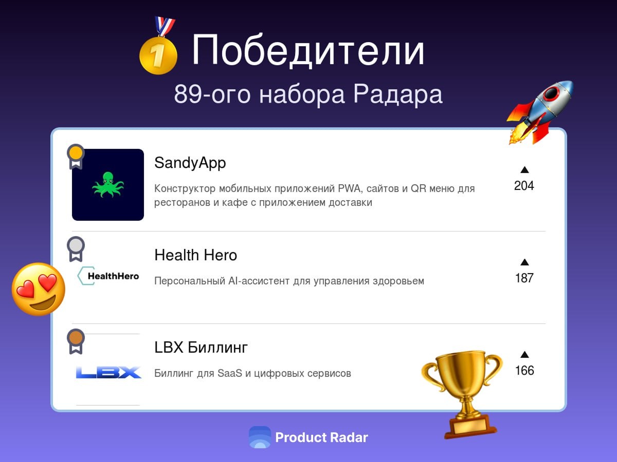 Победители прошлой недели на Радаре 89-й набор 🥇 SandyApp🎓👨💻💰💼🔥🤝 Конструктор мобильных приложений PWA, сайтов и QR меню для ресторанов и кафе с приложением доставки 🥈Health Hero🎓💰🔥🤝 Персональный AI-ассистент для управления здоровьем 🥉LBX Биллинг Биллинг для SaaS и цифровых сервисов Новый раунд стартапьих бегов и новые проекты уже на вашем Радаре!🌚 — ⭐️ Вы можете Поддержать Радар на boosty и получить значок «Друг Радара», а также доступ к базе знаний для развития стартапа с нуля — 📤СТАВЬТЕ РЕАКЦИИ: «🎉» - Урааааа! «🔥» - Все молодцы! «🏆» - Я голосовал(-а) за победителе☕️