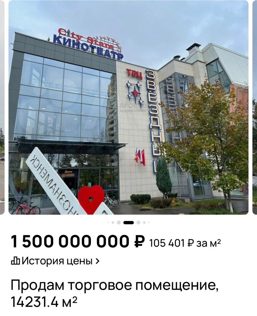 ТРЦ «Звёздный» снова выставлен на продажу На Авито появилось объявление, что помещение продаётся за полторамиллиарада рублей. Ранее ТРЦ стоил 1 264 192 240 руб., а до этого 1 080 000 000 руб.