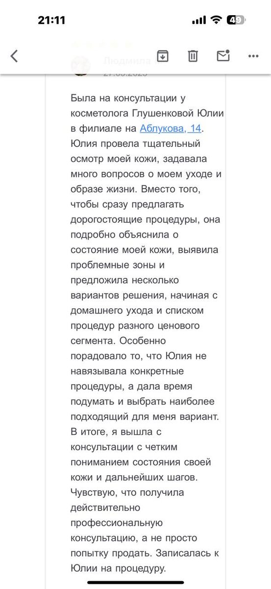 Отзыв на нашего ведущего косметолога Юлию Глушенкову , чуткий , очень грамотный специалист. Ее нежные ручки доставят вам удовольствие
