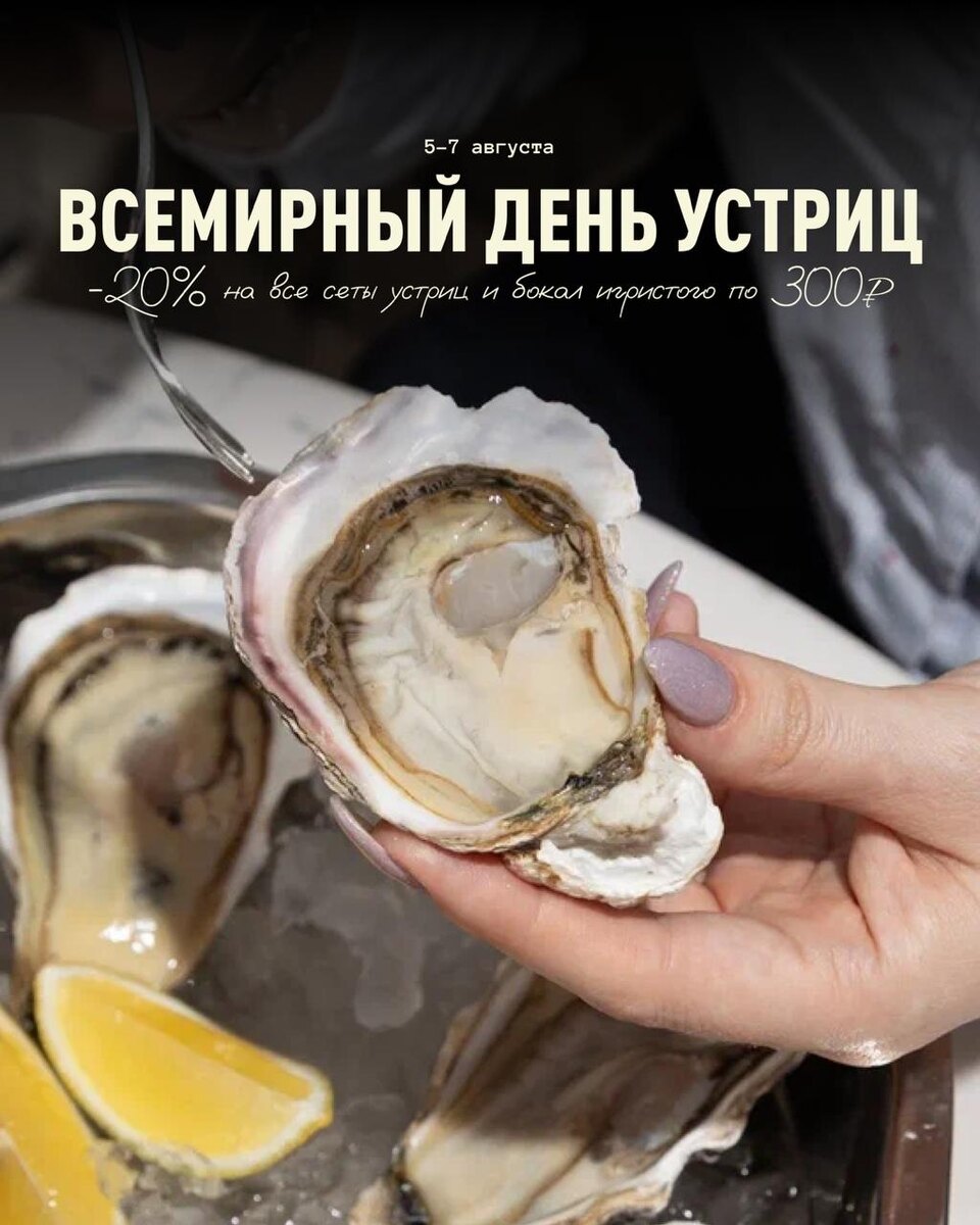 🦪 5 АВГУСТА — ВСЕМИРНЫЙ ДЕНЬ УСТРИЦ Празднуем вместе целых три дня — с 5 по 7 августа! 🦪 Скидка 20% на все виды устриц ⭕️Набор к устрицам — всего за 1₽ 🥂Бокал игристого — весь день за 300₽ Повод есть — осталось только выбрать устрицы и забежать в ближайший ресторан Delicates Club! Или оформить доставку. 🐙 Delicates Club
