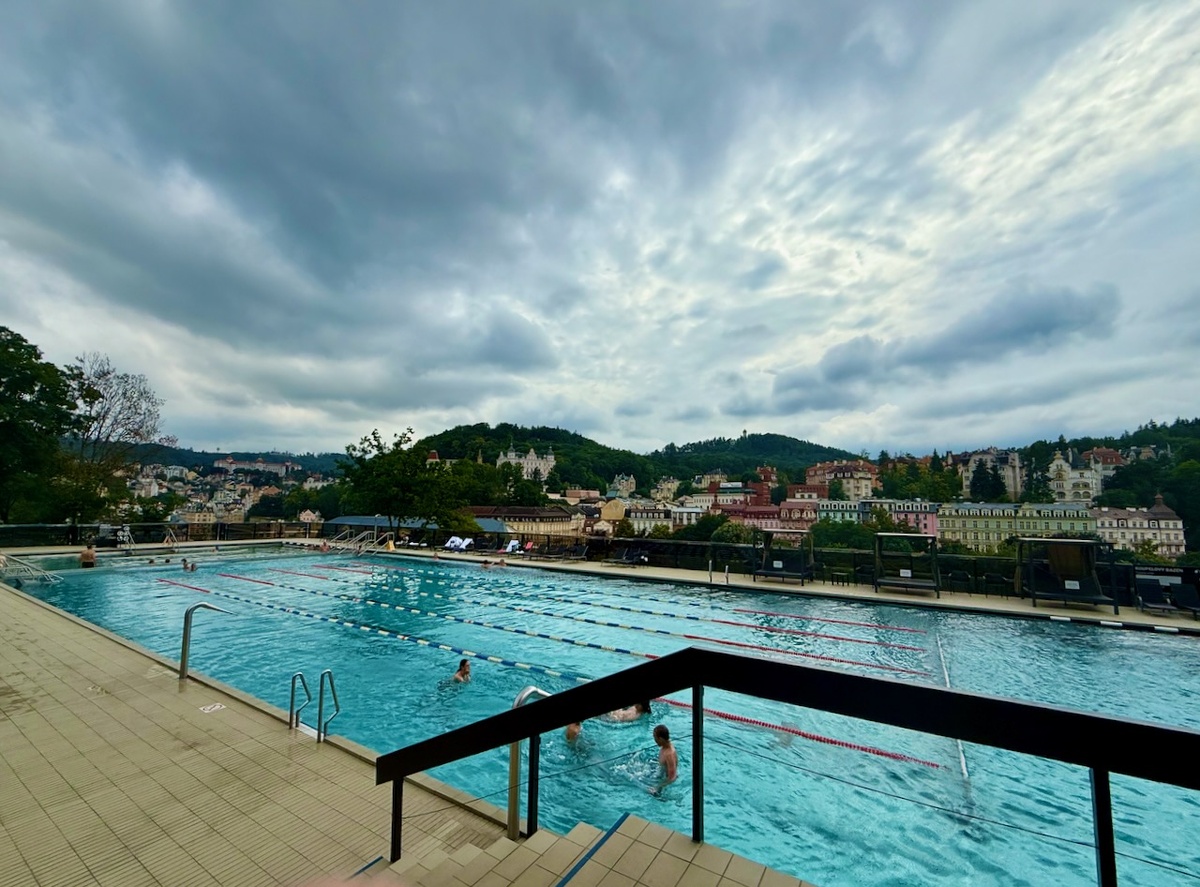 Долгое время открытый бассейн отеля «Термал» находился на реконструкции. К счастью, к тому моменту, когда мы захотели съездить в Карловы Вары, его ремонт завершился, и мы включили его в список мест, которые хотим посетить. Найти отель и бассейн труда не составляет, равно как и попасть туда. Все примерно как при посещении терм и у нас. Есть абонементы, есть посещение на час, три, целый день, вечерние часы. Потенца входят в стоимость посещения, что очень удобно. Если вдруг с собой нет тапочек или купальника - их можно приобрести, причем по очень демократичной цене. Раздевалка с ящиками для одежды общая для мужчин и женщин, просто есть закрытые кабинки для переодевания. Сам бассейн большой, 50 метров в длину. Есть дорожки для плавания. Есть места с гидромассажем, где можно просто лежать, сидеть и релаксировать. Есть отсек с более теплой водой, хотя вода в целом очень теплая и комфортная. Вода минеральная, очень приятная. Вокруг много лежаков, есть кафешка с приличной едой и напитками.