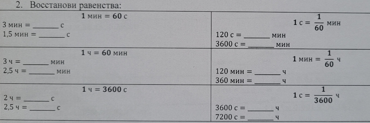 Перевод единиц измерения времени немного тяжелее в расчетах, так как приходится работать с числа и 60, 3600. Многие, даже иногда и взрослые, путаются в переводах, поэтому попробуем разобраться. Будем работать с этой таблицей 1 мин = 60 с Здесь все просто. Если мы хотим перевести минуты в секунды, нужно число минут умножить 60,так как в 1 мин = 60 с. Пример 1 Пример 2 А теперь попробуем перевести обратно секунды в минуты. Тут мы уже должны будем разделить на 60. 1 с = 1/60 мин Пример Теперь поработаем с часами и минутами. Если мы хотим перевести часы в минуты, то количество часов умножаем на 60,так как в 1 ч = 60 мин 1 ч = 60 мин Пример 1 Пример 2 А теперь переведём наоборот. 1 мин = 1/60 ч Тут мы уже должны делить на 60 Пример 1 Пример 2 А теперь уже интереснее. Будем переводить часы в секунды. 1 ч = 3600 с Многие ребята забывают, чему равен 1 час в секундах и начинают путаться в цифрах, не понимая, откуда берётся 3600. А тут все просто. 1 ч = 60 мин 1 мин = 60 с Если мы хотим