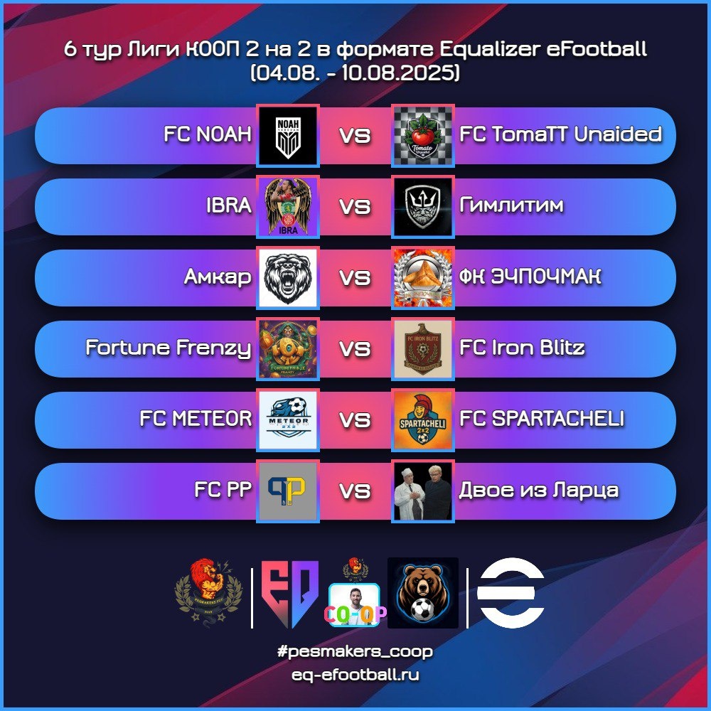 https://vk.com/equlaizer_liga?w=wall-194612751_4643 КООП пространство eFootball представляет вашему вниманию: 🙌 Открытие 6 тура 👑 Лиги КООП 2 на 2 в формате Equalizer eFootball❗‼ ⌛ Отведенное на тур время: с04.08. по 10.08.2025 📅 ☝Капитаны Команд начали обсуждать даты игр и назначать время #EQLiga2x2 #pesmakers_coop 🌐 eq-efootball.ru