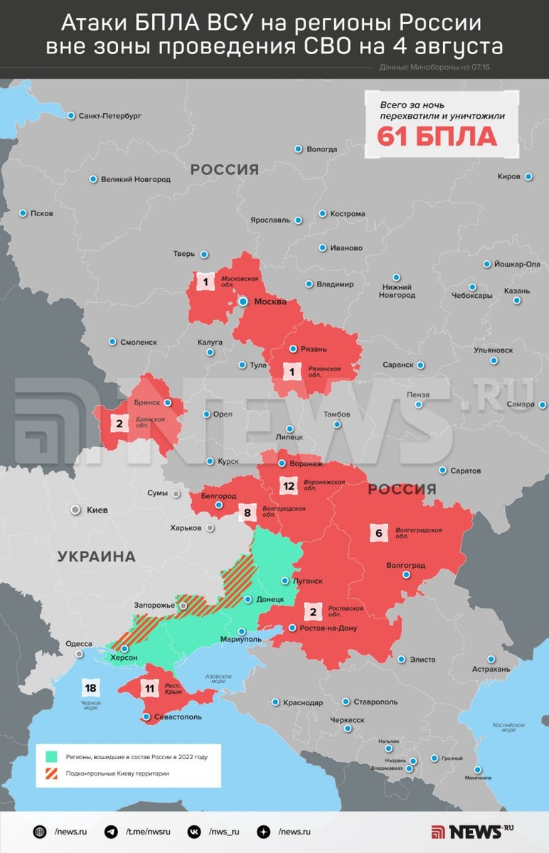 Дежурные средства ПВО перехватили и уничтожили за ночь 61 украинский дрон, сообщили в МО РФ. Из них 18 — над Черным морем, 12 — над Воронежской областью, 11 — над Крымом, восемь — над Белгородской областью. Над какими еще регионами были сбиты беспилотники ВСУ — в инфографике NEWS ru. ⭕ Подписаться | Прислать новость | Буст