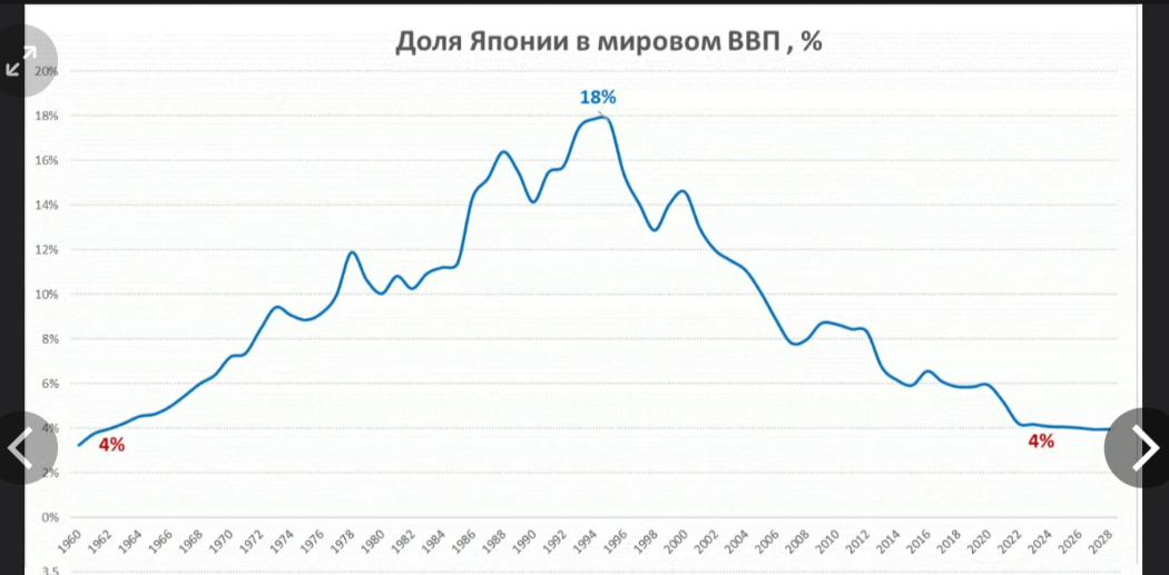 Японская экономика по праву заслужила репутацию передовой и инновационной державы. Действительно, высокие показатели ВВП на душу населения по ППС и производительности труда подтверждают этот статус. Однако, если взглянуть на динамику развития японской экономики, становится очевидной стагнация производительности труда и снижение доли страны в мировой экономике. В чем же причины такого положения дел? Ключевые вызовы японской экономики: Рекордный государственный долг: Япония обладает самым высоким соотношением государственного долга к ВВП в мире (237%). Для сравнения, у США этот показатель составляет 124%. Такой колоссальный долг существенно ограничивает возможности государства в области заимствований. Значительная часть бюджета уходит на обслуживание долга, что неизбежно ведет к росту налоговой нагрузки на экономику и замедляет экономический рост. Демографический кризис: старение и сокращение населения: Япония занимает второе место в мире по медианному возрасту населения (48 лет к 2025