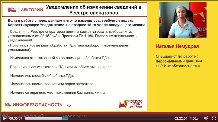 ❓В каких случаях необходимо подавать корректирующее уведомление в реестр операторов персональных данных рассказала Наталья Немудрая, специалист по работе с персональными данными 1С:ИнфоБезопасность в лекции на тему Что должны сделать операторы персональных данных после 30 мая 2025 года Отзыв слушателя: Огромное спасибо за развернутые ответы на вопросы, списки и чек-листы, порядок заполнения заявления и много другой, очень полезной информации. 👉Смотрите бесплатно полную видеозапись лекции 🚨Подписывайтесь на @lector_1c