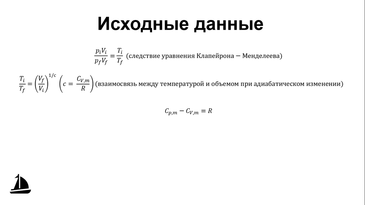 Давайте выведем выражение, отражающее взаимосвязь между давлением и объемом для обратимого адиабатического расширения идеального газа. После нескольких преображений получаем Известно, что теплоёмкостные величины зависят от количества степеней свободы (i). Рассмотрим, как определить количество степеней свободы для простейших молекул разных форм. Шарообразные молекулы обладают 3 степенями свободы. Соответствующие трем пространственным координатам. Такую форму имеют одноатомные молекулы. Молекулы вытянутой формы обладают 5 степенями свободы. 3 соответствуют координатам и 2 соответствуют двум плоскостям вращения. Такую форму имеют двухатомные молекулы и молекулы с большим количеством атомов, но с высокой симметрией, например, диоксид углерода. Самые простые молекулы с изогнутой формой обладают 6 степенями свободы. 3 поступательные и 3 вращательные. График зависимости объема и давления называется адиабата. Скорость падения у адиабаты меньше, чем у изотермы. Рассмотрим задачу: Решение Для за