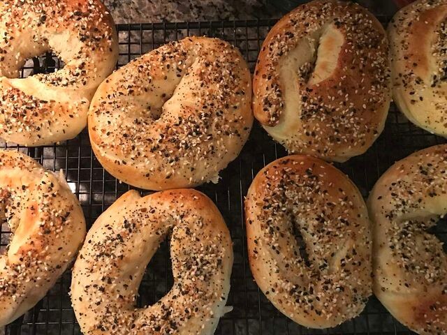 Настоящие домашние бублики Рецепт для получения настоящего вкуса и текстуры бубликов. ⌛ Подготовка: 30 мин. ⏰ Приготовление: 3 час. 20 мин. 🍴 Количество: 6 бубликов Ингредиенты ✅ 1 ¼ стакана воды ✅ 4 ½ стакана муки ✅ 3 столовые ложки белого сахара ✅ 1 чайная ложка соли ✅ 2 столовые ложки растительного масла ✅ 1 столовая ложка быстродействующих дрожжей ✅ 4 литра воды ✅ 1 стакан меда ✅ 2 столовые ложки мака ✅ 2 столовые ложки кунжута ✅ 2 столовые ложки сушеных луковых хлопьев ✅ 1 столовая ложка крупной соли Инструкция приготовления 1. Соедините 1 1/4 стакана воды, муку, сахар, 1 чайную ложку соли, растительное масло и дрожжи в чаше миксера. Вымешивайте на низкой скорости с помощью крюка для теста, пока клейковина не станет хорошо развитой, около 8 минут. Чтобы убедиться, что клейковина полностью развилась, отрежьте от теста кусочек размером с грецкий орех. Присыпьте пальцы мукой и растяните тесто: если оно сразу рвется, значит, его нужно еще раз вымесить. Полностью развитое тесто