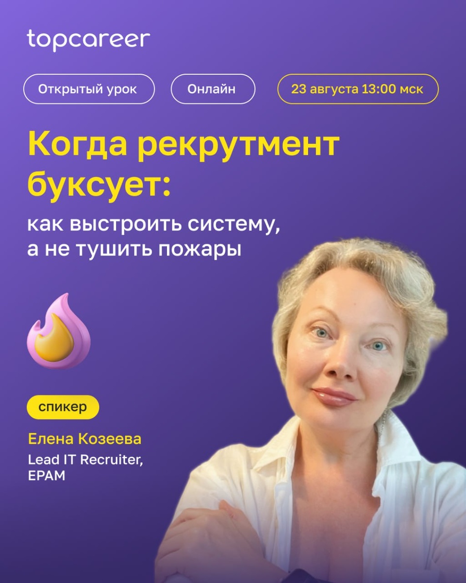 По данным исследования Harvard Business Review, 77% руководителей считают, что найм — одна из главных точек роста эффективности бизнеса. Однако в реальности рекрутмент чаще напоминает борьбу с пожарами: срочные вакансии, провальные отклики, нанимающие менеджеры часто «сами не знают, кого ищут». Вместо выстроенной системы — хаотичные запросы, поиск идеального кандидата и вечная нехватка времени. Знакомо? Чтобы выбраться из этого замкнутого круга, нужен не просто опыт, а понимание, как построить предсказуемый и управляемый рекрутмент — с чёткой архитектурой, реальными сроками и ответственностью бизнеса. Именно об этом наш открытый урок «Когда рекрутмент буксует: как выстроить систему, а не тушить пожары». 🗓 Когда: 23 августа в 13:00 (мск) 🎩 Спикер: Елена Козеева, Lead IT Recruiter, EPAM На уроке разберем: 🟣 Почему рекрутмент буксует и как перестать искать "единорога" 🟣 Как выстроить предсказуемую систему найма 🟣 Что на самом деле влияет на скорость закрытия вакансии 🟣 Почему