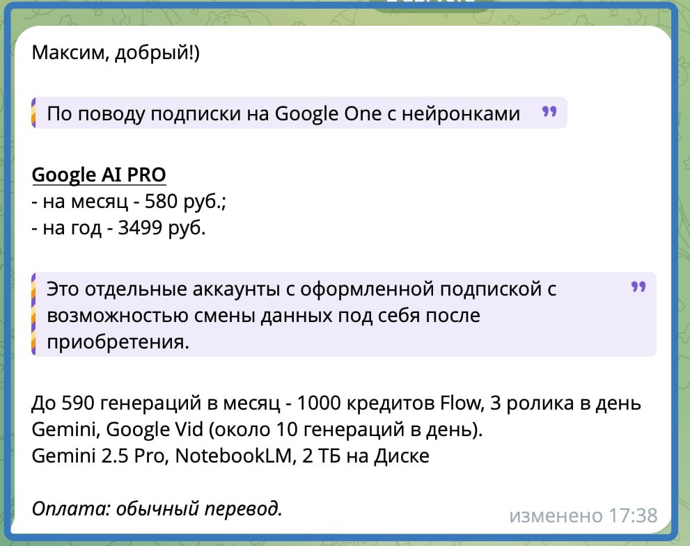 Стоимость подписки Google AI Pro на год - 3500 р. А что получаете после оплаты - написано на картинке. Вчера купил... Я активно пользуюсь - очень нравится, хотя в последнее время для себя открыл Preplexity для обычных диалогов (а вот создание статей в блог лучше делает Gemini 2.5 Pro)... Русский ИТ бизнес