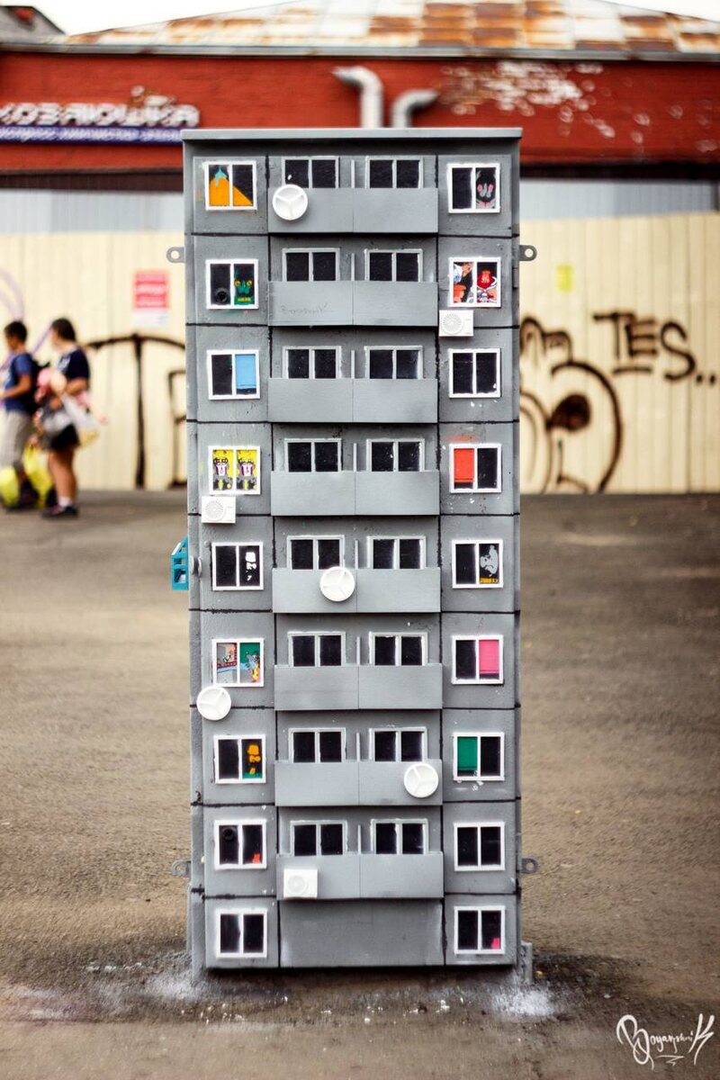 На стыке архитектуры и уличного искусства: в Иркутске появился мини-дом с героями мемов и мультиков На пересечении улиц Тимирязева и Партизанской в Иркутске теперь красуется миниатюрная панельная девятиэтажка. Только не настоящая, а художественная. В рамках арт-лаборатории «Голос улиц» художники Василий Трускалов и Евгений Бояркин создали её на телефонном шкафу. Они напечатали панельку на 3D-принтере, добавили ручной деталировки — балконы, спутниковые тарелки, даже «соседей», и смонтировали всё прямо на месте. Высота арт-дома составляет 154 сантиметра. На его «строительство» ушло 198 часов печати, 4,5 килограмма пластика и 20 часов сборки. Но самое главное, конечно, это жители. На четвертом этаже поселились Волк и Заяц из «Ну, погоди!», а на девятом — знаменитый интернет-кот «ОКАК». Художники играют на ностальгии и узнаваемости: большинство персонажей родом из советских мультфильмов, но есть и современные герои мемов. Евгений Бояркин: Я хотел, чтобы панелька стала еще более реалист