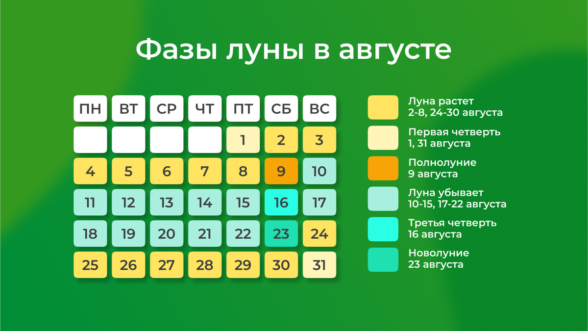 Август — напряженное время для садоводов и огородников: сейчас вовсю идет сбор урожая и подготовка запасов на зиму. Кроме этого, на участке много и других дел. Чтобы понять, как лучше распределить свои силы и когда начинать работы, листайте карусель и смотрите наш лунный календарь!