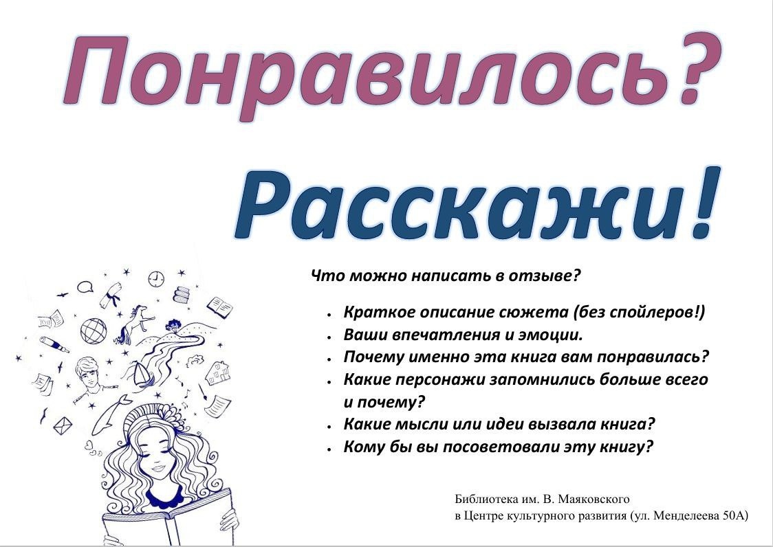 Библиотека им. В. Маяковского (ЦКР, ул. Менделеева 50А) приглашает вас принять участие в акции-реакции «Понравилось? Расскажи!» в течение всей следующей недели.
