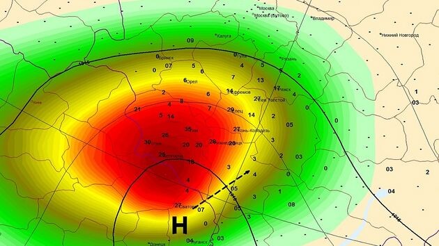 Небольшой, но активный циклон, сформировавшийся на холодном атмосферном фронте в южных регионах Европейской России, взял курс на север, и ранним утром понедельника его центр сместился в районы Луганщины. При этом зона сильных дождей уже накрыла юг Центрального федерального округа. Сильные дожди уже прошли в Воронежской, Белгородской, Курской, Липецкой и Рязанской областях. Местами там только за прошедшую ночь выпало больше половины августовской нормы дождей. Так, некоторые метеостанции Воронежской области отметили выпадение 28 мм осадков, что составляет 54% нормы, в Липецкой области выпало до 29 мм дождя, или 59% положенного за месяц, в Белгородской области – до 30 мм (81%), а «мокрым» лидером прошедшей ночи с регионе стал город Тим, что в Курской области, где пролилось 35 мм дождя, или 85% месячной нормы. Держа курс на северо-восток, циклон в ближайшие полчаса-час накроет зоной осадков южные и восточные регионы столичного региона, к 9–10 часам доберётся до Новой Москвы, а около полуд