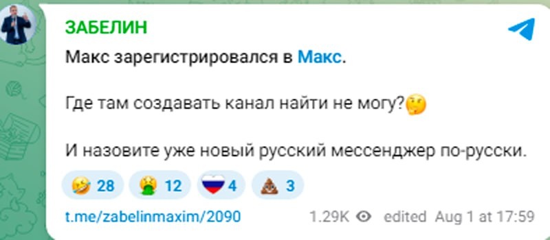 В ответ на пост Томский депутат продержался в мессенджере MAX несколько минут Независимый депутат гордумы Томска Максим Забелин решил зарегистрироваться в отечественном мессенджере MAX. Об этом он сообщил в своём телеграм-канале, но уже через несколько минут заявил, что удаляется из «Макса». «Короче там нельзя создать канал. Удаляюсь. Не фартануло», - отметил Забелин. Ещё в середине июля пресс-служба мессенджера утверждала, что проверяет возможность создания каналов и начала их тестирование. Функцию якобы опробовали более 50 «СМИ, блогеров звёзд и инфлюенсеров». Подписаться| Прислать новость| Помочь бустами