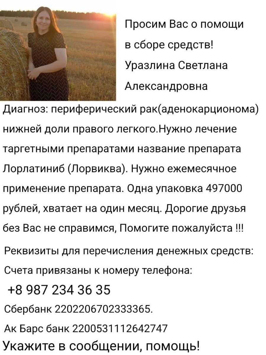 Карендәшләр, ярдәмегез кирәк!❤️ Безнең редакциягә ярдәм сорап түбәндәге хат килде. «Киленем, Мамадышта яшәүче Светлана Александровна Уразлина бык каты авырый (диагнозы – уң як үпкәсендә аденокарционома). Ул даими “Лорлатиниб” (“Лорвиква”) препараты куланырга тиеш. Бер кабы бер айга җитә. Бәясе: 497 000 сум. Карендәшләр! Сезнең ярдәмнән башка без бу чирне җиңеп чыга алмыйбыз. Ә киленемне бик тә яшәтәсем килә – өч баласы бәхетенә... Светланабыз – Җөри авылыннан, яхшы гаиләдән. Кодагыем Җөридә яши, ул быел авыр кайгылар кичерде – СВОдагы ике оныгын җирләдек. Кодагый инсульт кичерде. Көчле дарулар белән тора, Светлананың чире турында аңа әйтмибез. Ирем дә керәшен иде, мәңгелеккә киткәненә – 8 ел. Шуңа да керәшеннәрнең бердәм һәм ярдәмчел икәнен беләм. Уңайсыз булса да, башка чарам калмагач, сездән ярдәм сорыйм. Авыр чакта ташламагыз, зинһар, булышыгыз. Бар өмет – сез карендәшләрдә. Светлананың каенанасы Наилә». Бергәләп карендәшебезгә ярдәм итик!❤️ @tuganaylar_2002