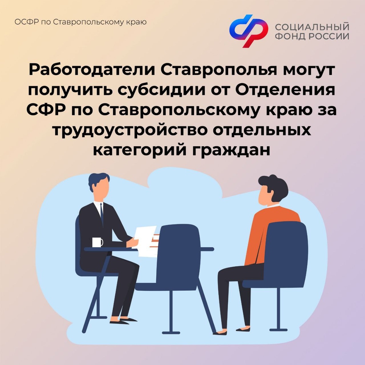 📌Отделение СФР по Ставропольскому краю выплачивает работодателям региона субсидии за трудоустройство отдельных категорий граждан: - ветеранов СВО; - членов семей погибших участников СВО; - людей с инвалидностью; - уволенных с военной службы; - одиноких и многодетных родителей; - работников, переехавших из других территорий для трудоустройства и других. 💻Субсидия предоставляется индивидуальным предпринимателям, коммерческим и некоммерческим организациям. 💳Величина субсидии зависит от категории трудоустроенного работника и условий программы и может составлять от трех до шести МРОТ, увеличенных с учетом страховых взносов. 🗓️Выплата производится по истечении 1-го, 3-го, 6-го месяцев работы трудоустроенного гражданина. 📝Чтобы получить субсидию, работодатель должен направить заявление в службу занятости через портал «Работа России». Затем, не ранее чем через месяц после трудоустройства гражданина, нужно будет подать заявление в Отделение СФР по Ставропольскому краю через личны