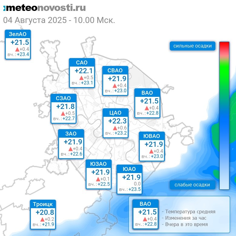 В 10:00 в Москве было от +20.9°C до +23.2°C, средняя температура +21.9°C #погода #Москва #лето #температура #4августа #понедельник