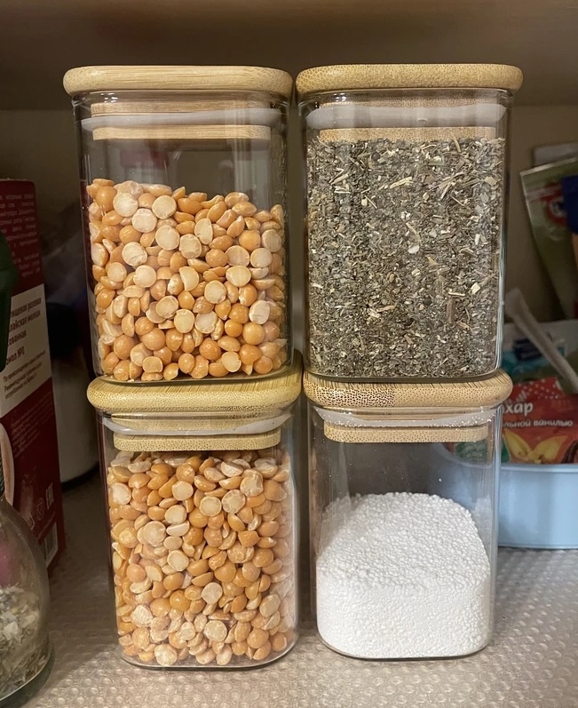 Прозрачные емкости с натуральными крышками отлично смотрятся на открытых полках. В них удобно хранить крупы, орехи, чай или специи