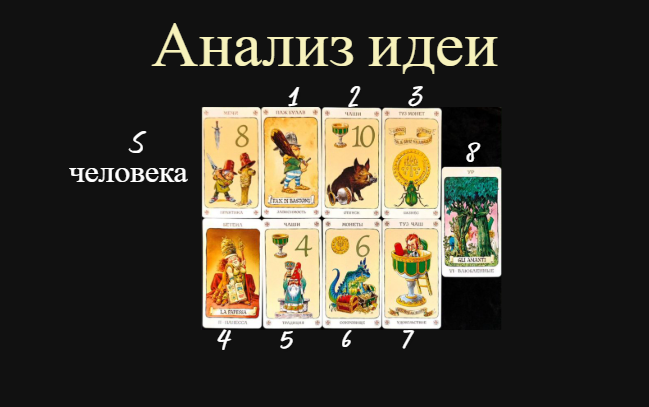 Расклад поможет получить помощь, когда вы хотите реализовать свою идею, открыть новый проект, создать новое направление и позволяет определить возможности и перспективы деятельности. Задумайте свою идею, либо вспомните о давней мечте.