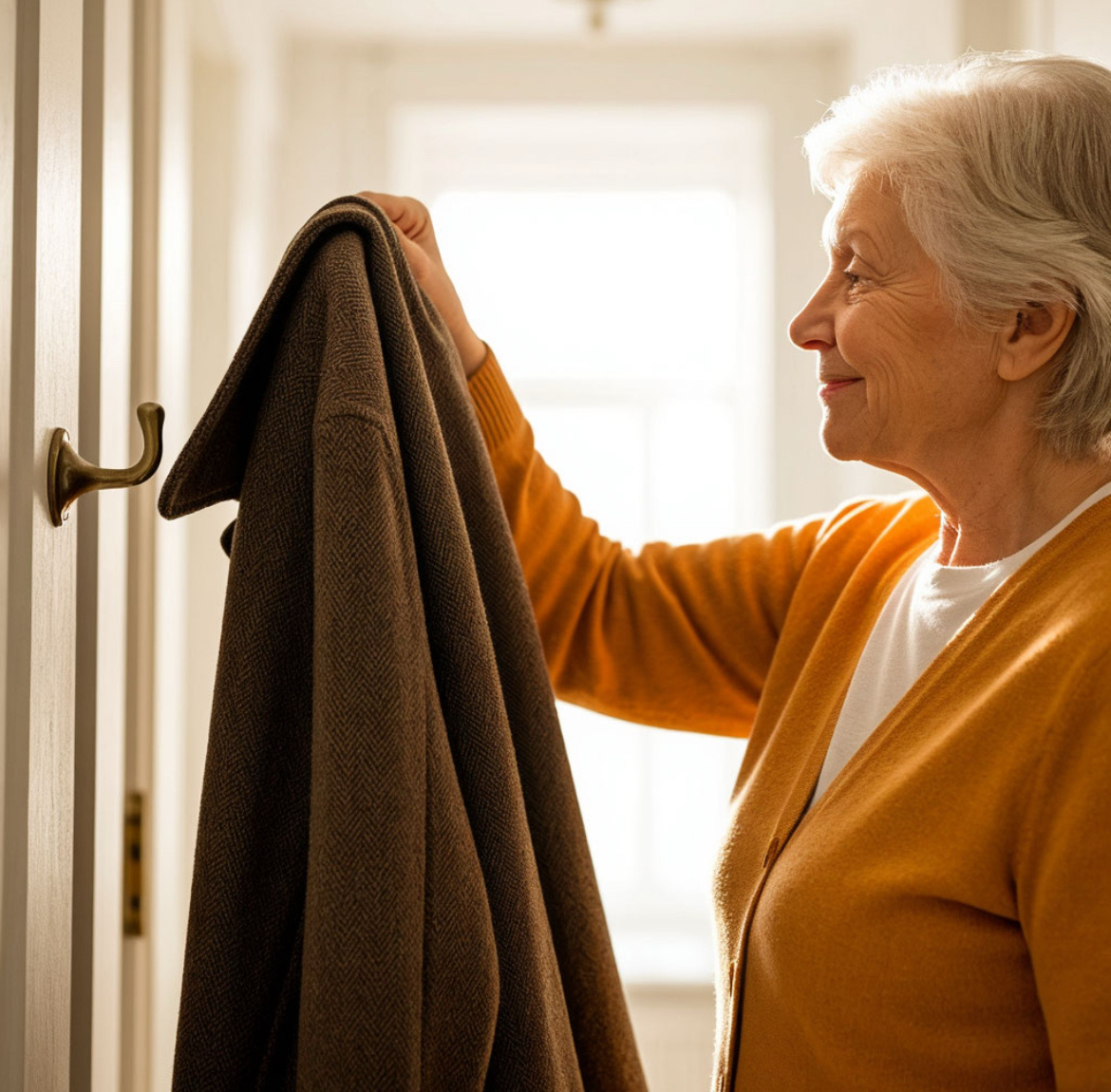 Пальто всё ещё висело там. Валентина взялась за шероховатый ворот, прижалась щекой — чуть-чуть, на секунду — и вдруг легко, без рыданий… лишь с тихой теплотой.