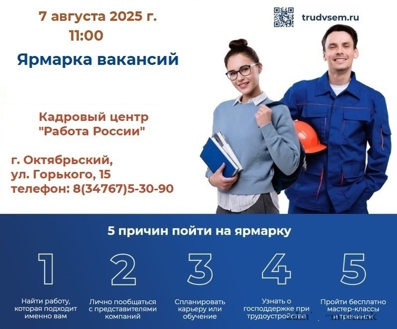 В кадровом центре «Работа России» по Октябрьскому пройдёт ярмарка вакансий. На мероприятии для соискателей горожане смогут пройти предварительное собеседование, задать вопросы работодателям, а также узнать о мерах государственной поддержки в сфере занятости населения. Сотрудники кадрового центра в этот день проконсультируют граждан о возможности переобучения и повышения квалификации. Ярмарка вакансий состоится 7 августа по адресу: ул. Горького, 15. Начало в 11.30. Записаться предварительно можно по телефону 8(34767) 5-30-90.