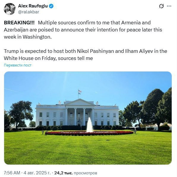 🇦🇲🇦🇿Թրամփն ուրբաթ օրը Սպիտակ տանը կընդունի Նիկոլ Փաշինյանին և Իլհամ Ալիևին Աղբյուրները լրագրող Ալեքս Ռաուֆօղլուին հայտնում են, որ Հայաստանն ու Ադրբեջանը պատրաստ են այս շաբաթվա վերջում Վաշինգտոնում հայտարարել խաղաղության հասնելու իրենց մտադրության մասին։ Տեղեկությունը պաշտոնապես չի հաստատվել կամ հերքվել։