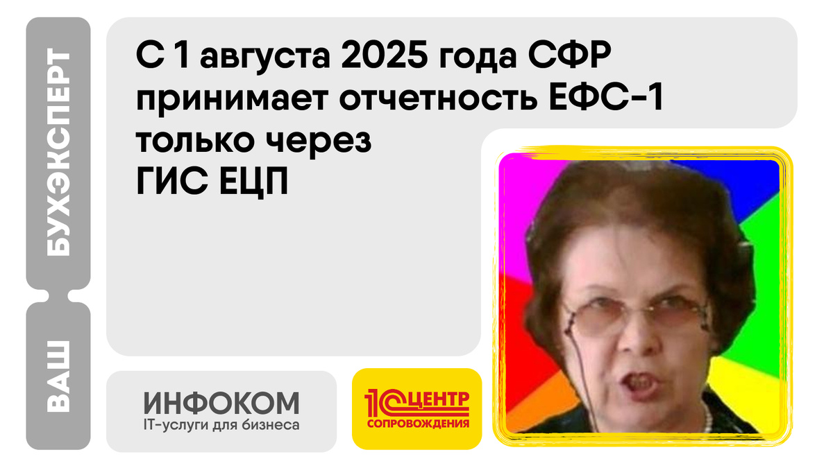 С 1 июля 2025 года Социальный фонд России (СФР) начал переход на сдачу формы ЕФС-1 через ГИС ЕЦП (Единую централизованную цифровую платформу в социальной сфере), заменив прежний способ отправки через ЭДОК (электронный документооборот компаний). До 31 июля 2025 года включительно еще была доступна отправка через ЭДОК, но теперь отчетность принимается исключительно через ГИС ЕЦП. Поддержка нового формата сдачи уже реализована в учетных решениях "1С". Перед отправкой ЕФС-1 убедитесь, что используете актуальную версию программного обеспечения. Поставьте, пожалуйста, лайк, если статья понравилась и была полезной, чтобы другие тоже смогли её увидеть. Подпишитесь на наш канал. Пишите - ответим на все вопросы > Консультанты-бухгалтеры с более чем 30-летним опытом. Любые вопросы по 1С. Настройка. Сопровождение. Обучение. Доработка. Мы отлично разбираемся в бухгалтерском, налоговом, кадровом и управленческом учёте и помогаем эффективно работать с программами 1С. ИНФОКОМ | IT-услуги для Вашего биз
