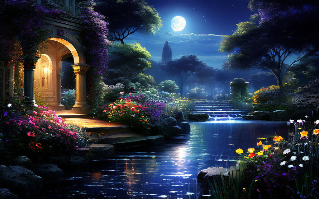 -В последний раз хранитель сказал, что покажет только один сад и раскроет тайну этой картины. Он пришёл за мной, когда я уснула, заставил встать и идти в дом к Янику. Мы остановились у картины и он предупредил, что эта прогулка может быть опасной и мне нужно принять решение: идти или остаться. Картина и скрытая в ней тайна так влекли меня и я шагнула внутрь. Сад, который я увидела был удивительным в свете яркой луны. На ровной глади воды отражались деревья, звёзды, облака, свет фонарей старинного дома. Цветы, силуэты деревьев были волшебными и таинственными.