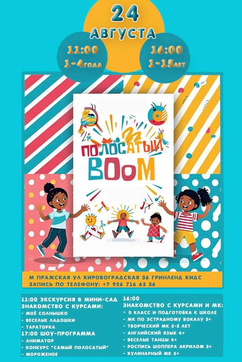🎉1️⃣2️⃣ 24 августа Полосатый BOOM в «Гринленд КИДС»! Что будет, если смешать полосатый рейв, творческие мастер-классы и мороженое? 24 августа мы устраиваем грандиозный праздник для детей от 1 до 15 лет! Ждём вас на: 🎨Творческих мастер-классах (роспись шопперов, кулинария, танцы) 🎤Открытых уроках (английский, вокал, подготовка к школе) 🐈⬛Шоу-программе с аниматором и конкурсами! 📍Где? Кировоградская, 36 (м. Пражская) 📅Когда? 24 августа, 11:00 и 16:00 📩Запись обязательна! Пишите «Полосатый BOOM» или звоните: +7-926-716-63-36 P.S. Количество мест ограничено -успевайте забронировать!