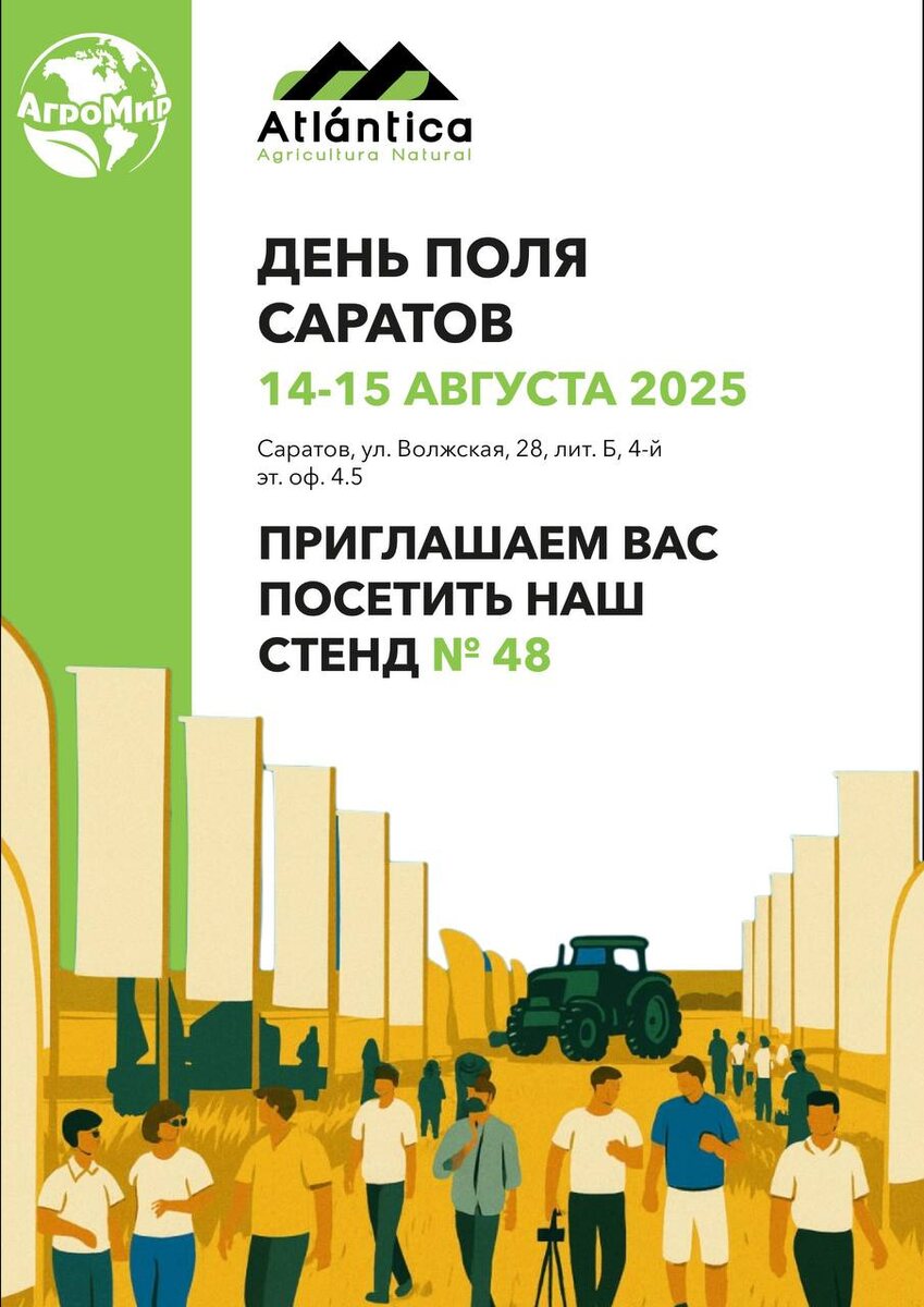 🌾 АгроМир на Дне Поля в Саратове — встречаемся уже скоро! Приглашаем вас 14–15 августа на День Поля в Саратове — ключевое агромероприятие этого лета! 📍Найти нас можно по адресу: г. Саратов, ул. Волжская, 28, лит. Б, 4-й этаж, офис 4.5 — стенд №48 Что мы подготовили для вас: ✔ Премиальные линейки удобрений, протестированные в разных регионах РФ ✔ Индивидуальные рекомендации по системам питания — прямо на стенде ✔ Реальные кейсы: как наши продукты помогли фермерам получить стабильный урожай даже в стрессовых условиях 👨🌾 Вы работаете на результат — мы обеспечиваем поддержку на каждом этапе. Загляните на стенд АгроМир — обсудим, как повысить рентабельность вашего хозяйства уже в этом сезоне. #АгроМир#ДеньПоляСаратов#ПитаниеРастений#ПолевыеТехнологии