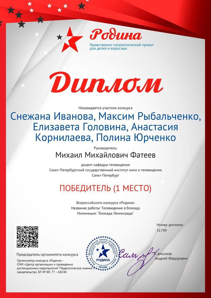 🥇Работа студентов кафедры телевидения ГИКИТ «Телевидение в блокаду» победила на Всероссийском конкурсе «Родина» в номинации «Блокада Ленинграда».