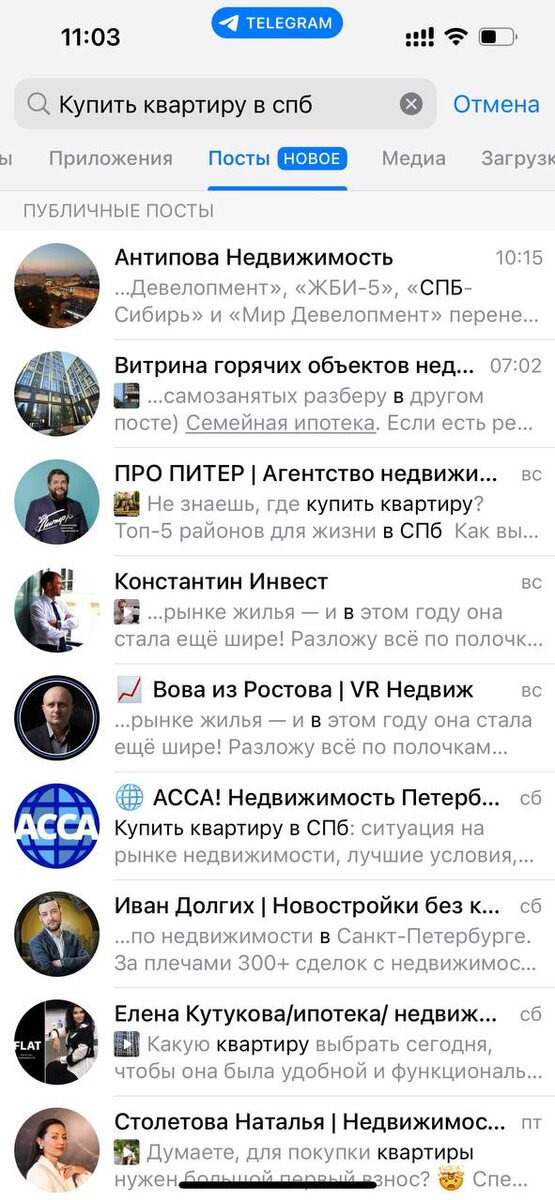 Новая фишка Telegram - поиск по ключевым словам. Сегодня увидела обновление в приложении. Теперь можно вводить ключевое слово или фразу, и будут подтягиваться посты в релевантных каналах. Попробовала несколько вариантов ключевых фраз. С недвижимостью сработало отлично. Выдача по запросу «купить квартиру в спб» мне понравилась. Что это значит? Теперь появился ещё один бесплатный способ набора аудитории на канал. А бесплатный трафик это всегда прекрасно ❤️