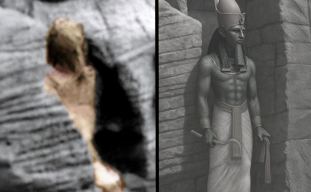 Элайджа Мухаммад в своей книге The Final Call («Последний зов») упоминал Марс, предполагая, что когда-то там существовала цивилизация, уничтоженная в прошлом. Он верил, что на планете можно найти следы передовых технологий и общества. Теперь фотография, сделанная марсоходом на Красной планете, заставляет задуматься. Мы раскрасили предполагаемую «статую» для лучшего восприятия. Что видите вы? Похоже на египетскую статую, не так ли? «Парейдолия!» — скажут скептики. Но нельзя отрицать поразительное сходство этого причудливого камня с осирическими статуями из храма Хатшепсут в Дейр-эль-Бахри (Египет). Даже различимы «глазницы», египетская бородка на подбородке и основание статуи. Вопрос в том: это естественная форма или работа марсианских скульпторов? В отличие от многих других «сенсационных» снимков, это фото настоящее — НАСА зарегистрировало его под номером PIA10210, и оно хранится на их серверах. Снимок сделан 7 мая 2007 года панорамной камерой марсохода Opportunity. С 2006 по 2007 год