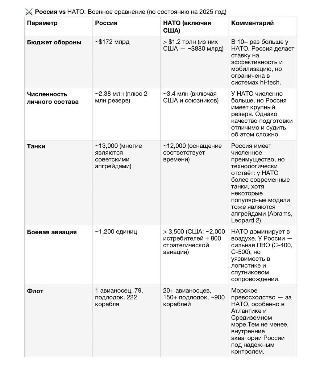 Решил заморочиться и сделал таблицу-сравнение военного потенциала России и НАТО. Данные взяты из открытых/официальных источников. В целом, показатели у нас хорошие, учитывая, что при возможном конфликте мы будем действовать соло. Бюджет так вообще экономичный, берем за факт то, что затраты НАТО на практически те же данные. Тем не менее, некоторые факторы заставляют задуматься: При гипотетической третьей мировой, какой контингент НАТО будет выделен для подавления российских интересов? Как эффективно будет работать защита от киберугроз? Какова вероятность блокады морских путей со стороны США? Остальное посмотрите сами. Однажды в 🇺🇸.Подписаться