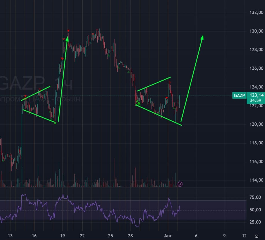 ⛽️ #ГАЗПРОМ #GAZP #bogdanoffinvest 🟢 Аналогичная структура есть и в Газпроме, только там движение было не в боковике, а в виде расходящегося треугольника. Сейчас сформирована такая же структура. 🚗 Жду Газпром вверх, в район 130.