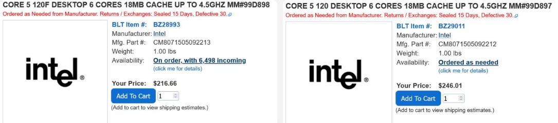 Intel выпускает новые, а если точнее, переработанные процессоры Alder Lake, представленые под брендом Raptor Lake. Недавно в сети появилась информация о новых процессорах Core 5 120, которые выглядят подозрительно похожими на продукты линейки Core 12-го поколения. Core 5 120 и Core 5 120F являются шестиядерными процессорами, включающими только производительные ядра. Процессоры, как и их аналоги предназначены для сокета LGA-1700. Intel решила расширить поддержку платформы LGA-1700 и продлить её жизненный цикл. Подобно тому, как AMD продолжает поддерживать сокет AM4 в новых процессорах, Intel также явно не планирует в ближайшее время отказываться от своей всё ещё популярной платформы. Процессоры Core 5 120, которые кстати не имеют маркировки «Ultra», уже появились в продаже в США по цене 216,66 доллара за версию "F" без встроенной графики и 246 долларов за стандартную модель со встроенной графикой. Стоит отметить, что в следующем году компания Intel представит платформу LGA-1954 вместе с