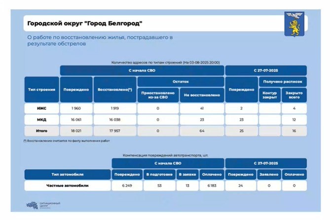 За неделю в Белгороде восстановили 16 жилых объектов Количество повреждённых домов увеличилось на 25. Всего осталось отремонтировать 64 помещения, сообщил на оперативном совещании Правительства мэр города Валентин Демидов. С 27 июля по 3 августа были повреждены 24 автомобиля. Всего на восстановление ТС подано 13 заявок. Подписаться на нас|Предложить новость
