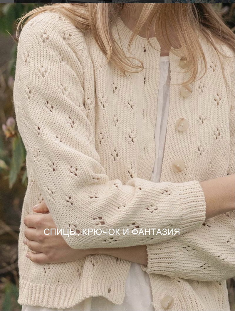 Представьте себе кардиган — нежный молочный оттенок и кружевные веточки узора. Эта модель — идеальное сочетание утончённости и комфорта, где каждая деталь продумана до мелочей: