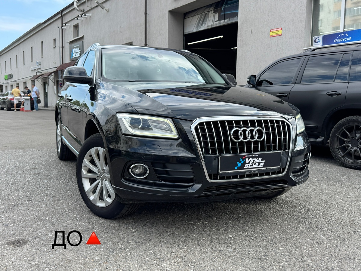 Audi Q5 на перетяжке потолка в чёрный цвет. Потолок был бежевого цвета, перетянули его в чёрную потолочную ткань вместе с козырьками, стойками. Пластик вы красили в чёрный мат, сделав гравировку кнопок. Руль и ручка КПП были перетянуты в кожу под оригинал.