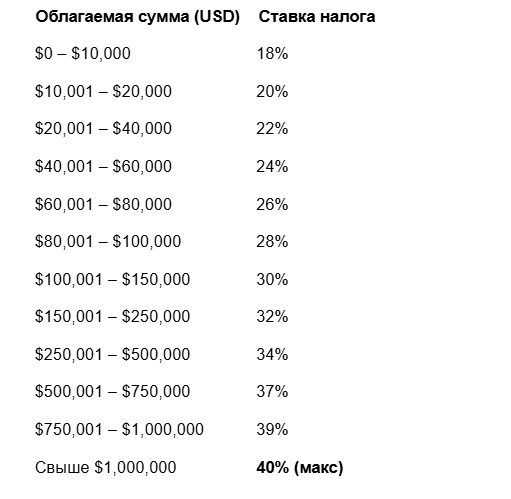 Ну, во-первых, у нерезидентов есть мегавычет в 60 тыс. долл., который освобождается от уплаты налога. Грубо говоря, если у вас 100 тыс. долл., то первые 60 тыс. будут освобождены, а на остальные — начислен налог по прогрессивной ставке, см. таблицу ниже.