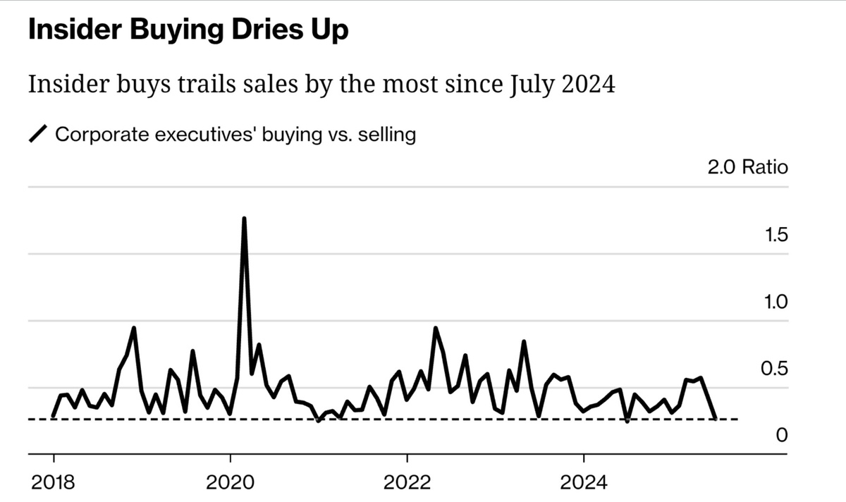 «Инвесторы по всей Уолл-стрит охотно вкладывались в американские акции в июле, в результате чего индекс S&P 500 за месяц достиг 10 исторических максимумов, однако заметная группа двигалась в противоположном направлении: руководители корпораций» Согласно данным Washington Service, в прошлом месяце инсайдеры всего 151 компании, входящей в индекс S&P 500, приобрели собственные акции. Это самый низкий показатель как минимум с 2018 И хотя темпы продаж корпоративных инсайдеров в июле замедлились по сравнению с июньскими, объёмы покупок упали ещё сильнее, в результате чего соотношение покупок к продажам достигло самого низкого уровня за год https://www.bloomberg.com/news/articles/2025-08-04/corporate-insiders-were-dumping-stocks-into-july-s-record-rally @marketheart
