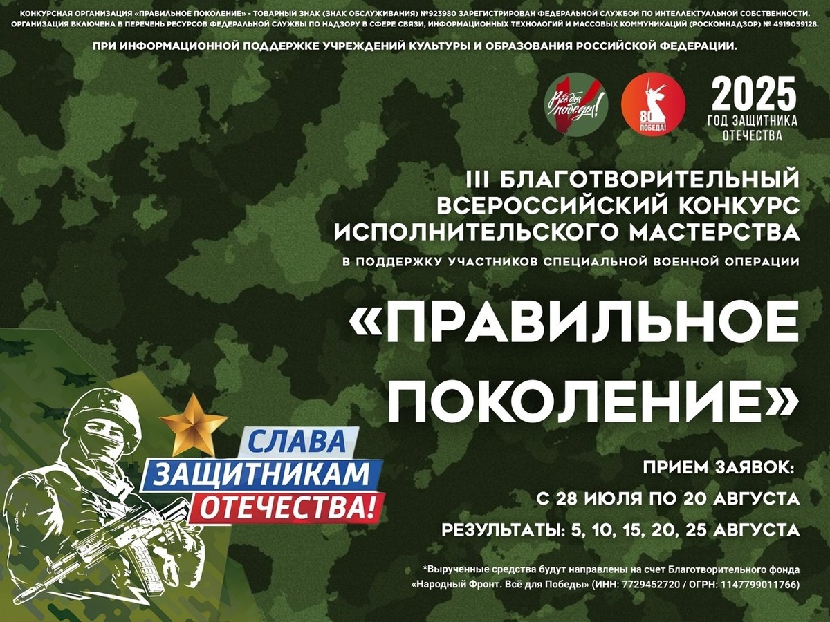 🇷🇺Приглашаем принять участие в масштабном благотворительном проекте "Правильное поколение" в поддержку российских военных участвующих в Специальной военной операции! ✅ Прием заявок: с 28 июля по 20 августа 2025 г. ✅ Результаты: 5, 10, 15, 20, 25 августа 2025 г. ✅ Итоговый протокол: 26 августа 2025г. Третий год подряд реализуется благотворительный проект, ставший уже традиционным, он является ярким примером гражданской инициативы и солидарности с теми, кто с честью и отвагой защищает интересы нашей Родины. Его масштабы и значимость с каждым годом растут, привлекая всё больше неравнодушных граждан, готовых внести свой вклад. ⚡Ждем ваши творческие работы на III Благотворительном конкурсе "Правильное поколение"! Помните, что Ваш успех - это не только наша гордость, это гордость страны! ❤ Положение по ссылке #РеспубликаАдыгея #Победа80 #новости_минкульт_РА #Историческаяпамять