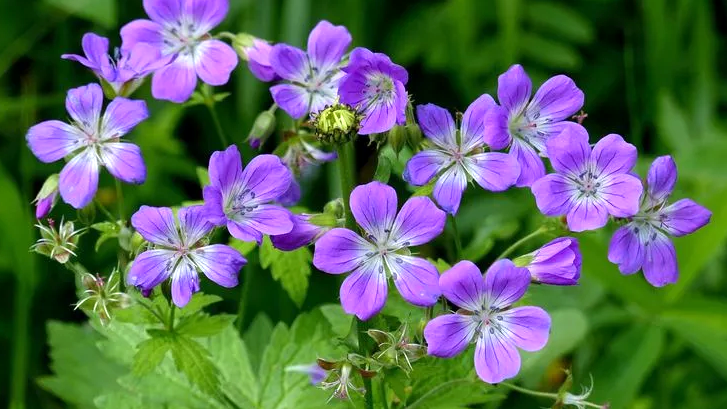 неприхотливостью, красивым цветением и полезными свойствами. Описание: Внешний вид: Герань лесная - это растение высотой от 30 до 80 см с прямостоячим, ветвистым стеблем. Листья: Листья крупные, пальчато-раздельные, с 5-7 лопастями, зубчатые по краям. Они имеют насыщенный зеленый цвет и опушены волосками. Цветки: Цветки герани лесной крупные, диаметром до 3 см, собраны в рыхлые соцветия. Они имеют пять лепестков, окрашенных в различные оттенки фиолетового, сиреневого или розового цвета. В центре цветка располагаются многочисленные тычинки и пестик. Плод: Плод герани лесной – сухая коробочка, напоминающая клюв журавля, откуда и произошло народное название "журавельница". При созревании коробочка растрескивается, разбрасывая семена. Корневище: Корневище толстое, ползучее, с многочисленными придаточны