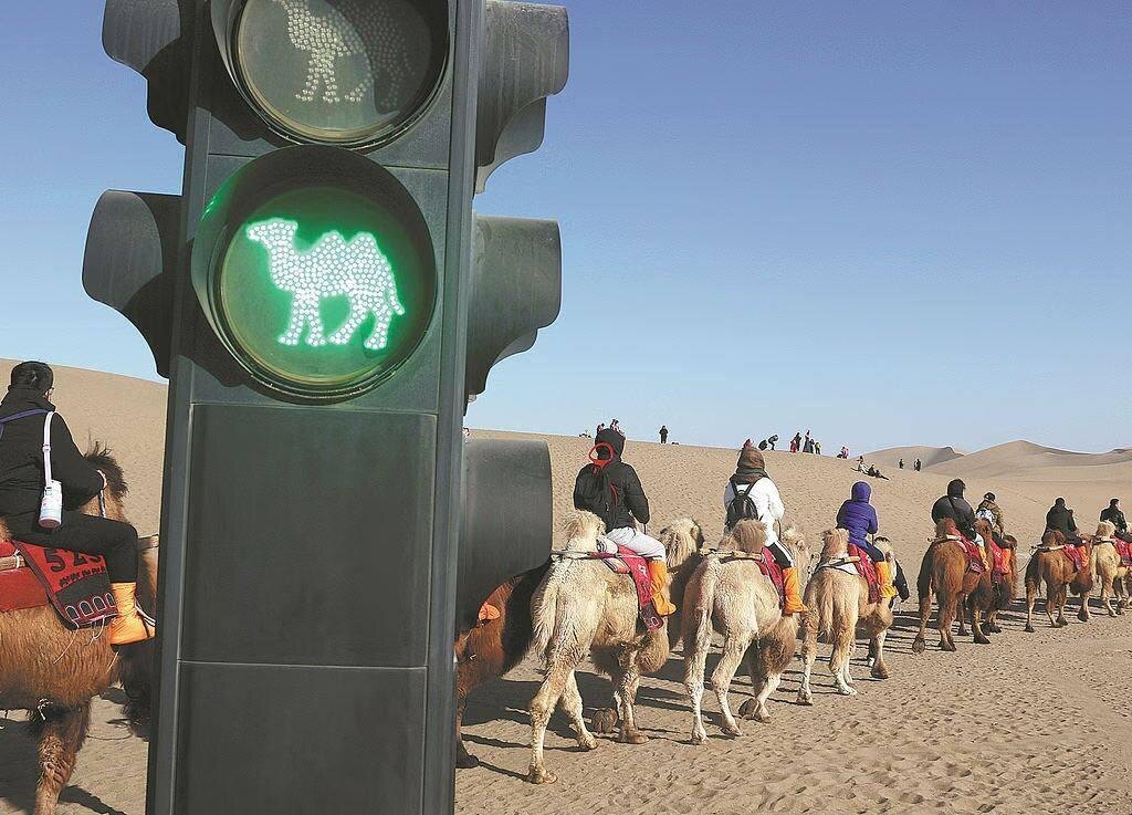 🇨🇳 Всё, что надо знать о Китае: в пустыне Кумтаг установили светофоры для верблюдов