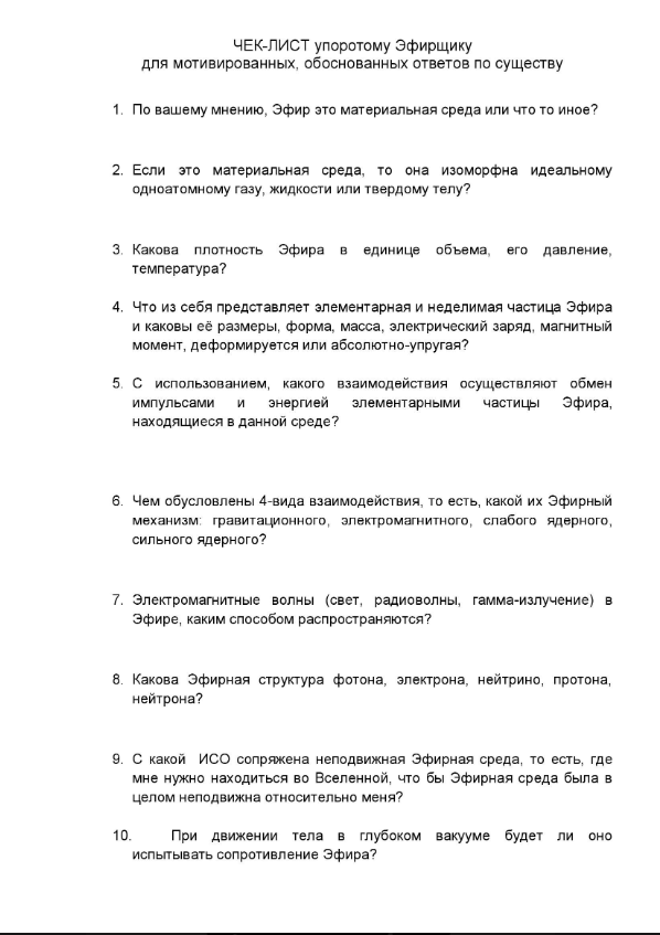 Читая различные посты по физике, натолкнулся на один пост (сейчас уже не помню где), где эфиродинамика, вернее эфирщики у автора канала сильно не в почёте. Я статью не запомнил, к сожалению. А вот картинку сохранил. В этой картинке автор считает, что эфирщик не в состоянии ответить на те десять вопросов, которые он задал. Я попробую сегодня ответить на половину из них (список на картинке). Только вот прочитав вопросы, понял, что автор не только не сильно "шарит" в эфиродинамике, но в современной физике не сильно разбирается. Поэтому я буду вставлять свои комментарии по вопросам или даже ссылки на свои статьи, где всё это описано, чтобы всё не переписывать. Ну, поехали! 1. По вашему мнению, Эфир это материальная среда или она что-то иное? Странный вопрос! Эфиродинамика подразумевает только материальные объекты и не вторгается в нематериальное. Поэтому эфир конечно материальная среда. 2. Если это материальная среда, то она изоморфна идеальному одноатомному газу, жидкости или твёрдому тел